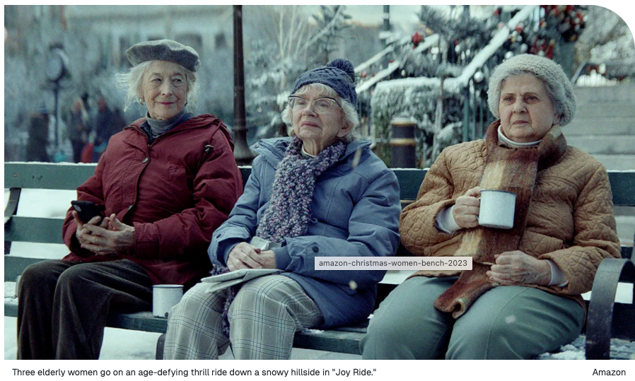 ..Three lifelong friends sit on a snowy bench watching children sledding. One of the women fires up her Amazon app and orders three sled-worthy seat cushions.